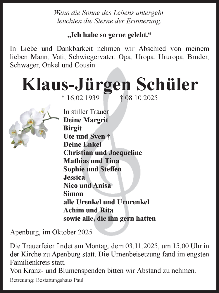 Hier finden Sie alle Traueranzeigen aus der Zeitung, die bisher für Klaus-Jürgen Schüler erschienen sind. Weitere Traueranzeigen, die in der Zeitung erscheinen, werden hier ebenfalls aufgelistet