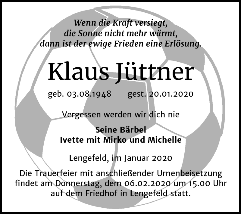 Hier finden Sie alle Traueranzeigen aus der Zeitung, die bisher für Klaus Jüttner erschienen sind. Weitere Traueranzeigen, die in der Zeitung erscheinen, werden hier ebenfalls aufgelistet