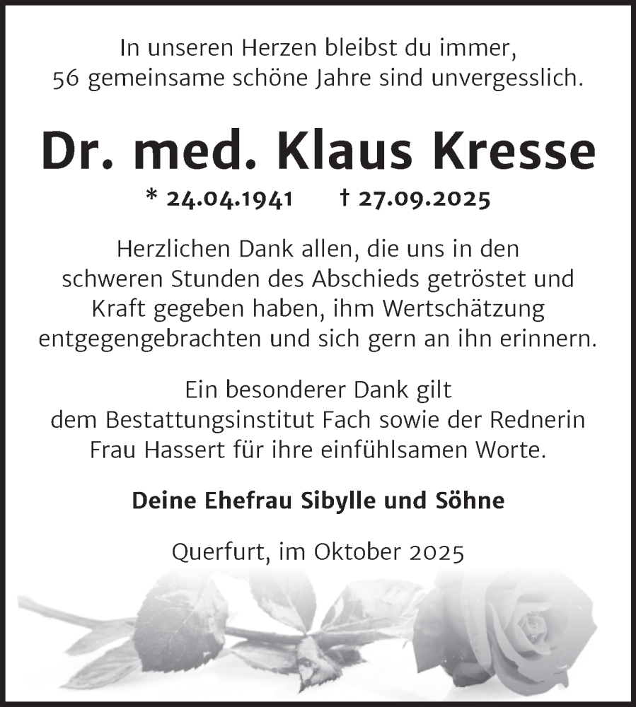 Hier finden Sie alle Traueranzeigen aus der Zeitung, die bisher für Klaus Kresse erschienen sind. Weitere Traueranzeigen, die in der Zeitung erscheinen, werden hier ebenfalls aufgelistet