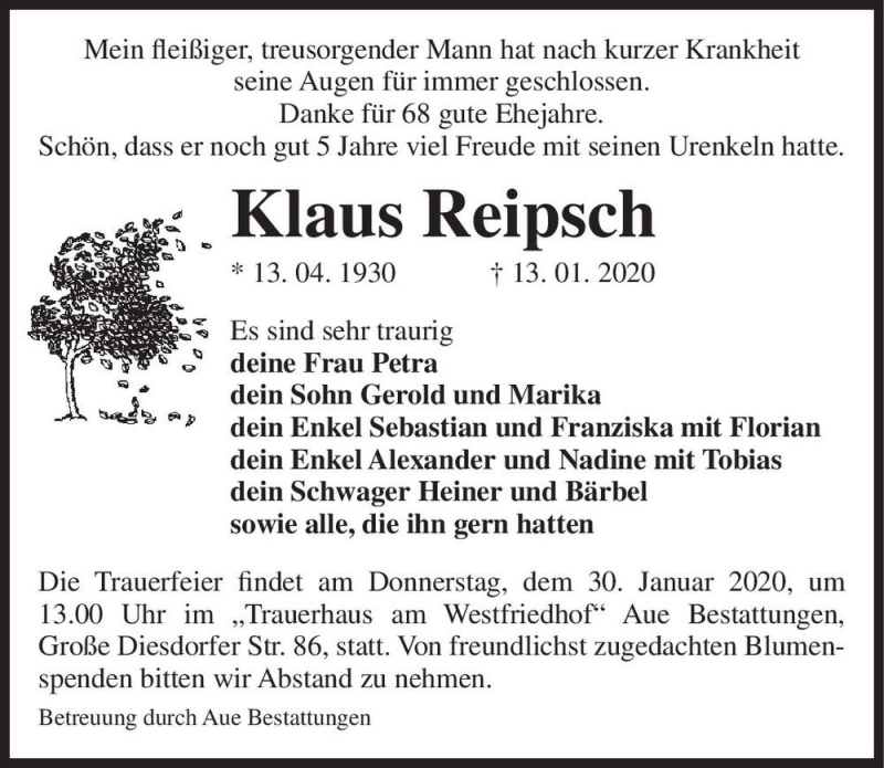 Hier finden Sie alle Traueranzeigen aus der Zeitung, die bisher für Klaus Reipsch erschienen sind. Weitere Traueranzeigen, die in der Zeitung erscheinen, werden hier ebenfalls aufgelistet