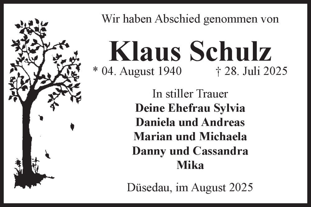 Hier finden Sie alle Traueranzeigen aus der Zeitung, die bisher für Klaus Schulz erschienen sind. Weitere Traueranzeigen, die in der Zeitung erscheinen, werden hier ebenfalls aufgelistet