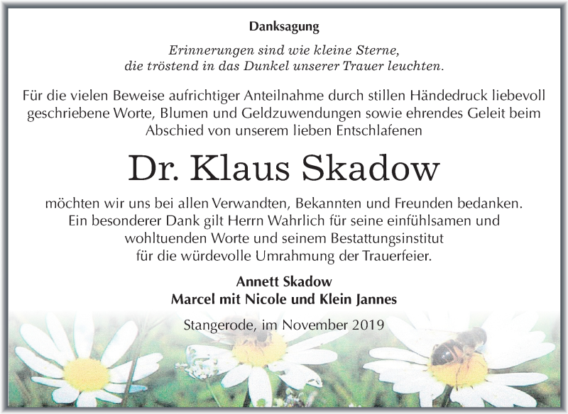 Hier finden Sie alle Traueranzeigen aus der Zeitung, die bisher für Klaus Skadow erschienen sind. Weitere Traueranzeigen, die in der Zeitung erscheinen, werden hier ebenfalls aufgelistet