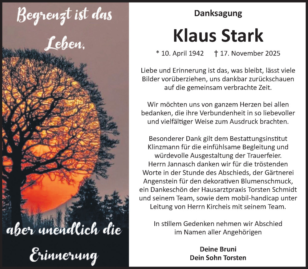 Hier finden Sie alle Traueranzeigen aus der Zeitung, die bisher für Klaus Stark erschienen sind. Weitere Traueranzeigen, die in der Zeitung erscheinen, werden hier ebenfalls aufgelistet