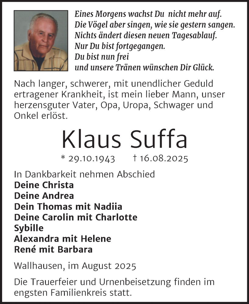 Hier finden Sie alle Traueranzeigen aus der Zeitung, die bisher für Klaus Suffa erschienen sind. Weitere Traueranzeigen, die in der Zeitung erscheinen, werden hier ebenfalls aufgelistet