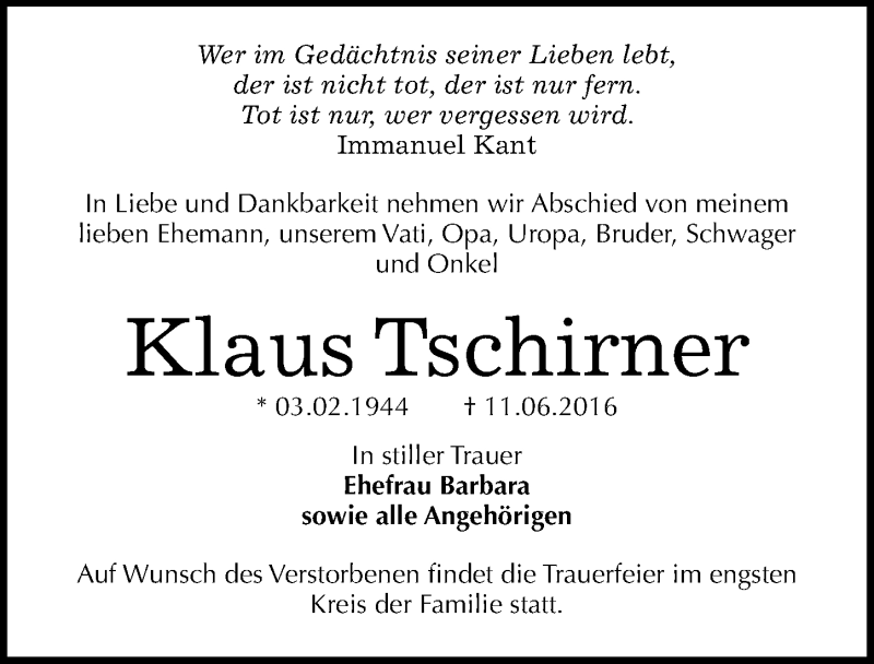 Hier finden Sie alle Traueranzeigen aus der Zeitung, die bisher für Klaus Tschirner erschienen sind. Weitere Traueranzeigen, die in der Zeitung erscheinen, werden hier ebenfalls aufgelistet