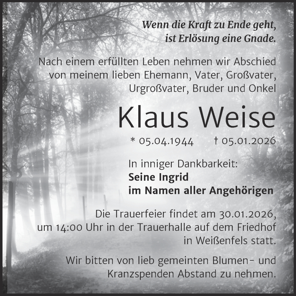 Hier finden Sie alle Traueranzeigen aus der Zeitung, die bisher für Klaus Weise erschienen sind. Weitere Traueranzeigen, die in der Zeitung erscheinen, werden hier ebenfalls aufgelistet