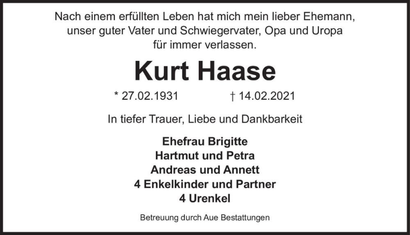 Hier finden Sie alle Traueranzeigen aus der Zeitung, die bisher für Kurt Haase erschienen sind. Weitere Traueranzeigen, die in der Zeitung erscheinen, werden hier ebenfalls aufgelistet