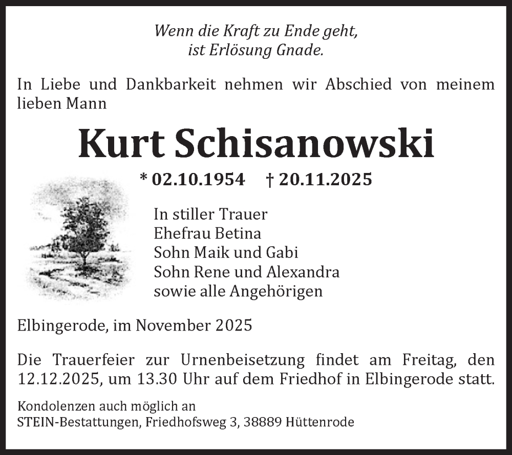 Hier finden Sie alle Traueranzeigen aus der Zeitung, die bisher für Kurt Schisanowski erschienen sind. Weitere Traueranzeigen, die in der Zeitung erscheinen, werden hier ebenfalls aufgelistet