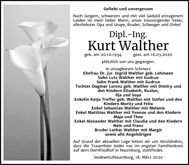 Hier finden Sie alle Traueranzeigen aus der Zeitung, die bisher für Kurt Walther erschienen sind. Weitere Traueranzeigen, die in der Zeitung erscheinen, werden hier ebenfalls aufgelistet