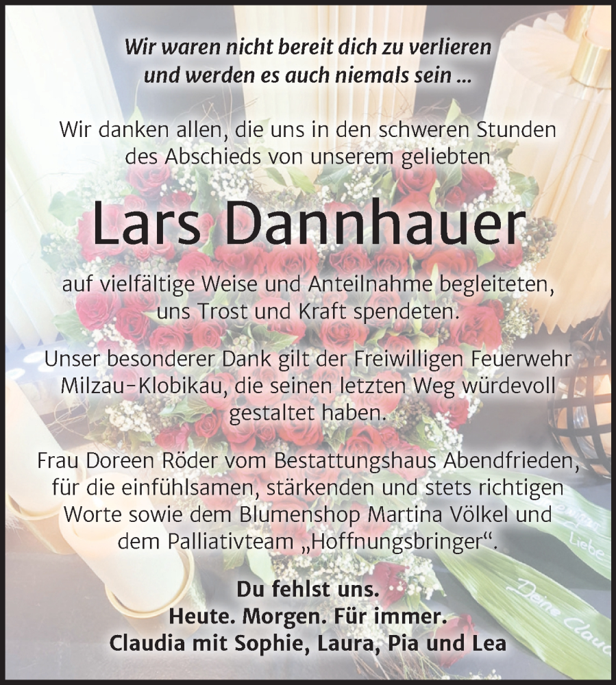 Hier finden Sie alle Traueranzeigen aus der Zeitung, die bisher für Lars Dannhauer erschienen sind. Weitere Traueranzeigen, die in der Zeitung erscheinen, werden hier ebenfalls aufgelistet