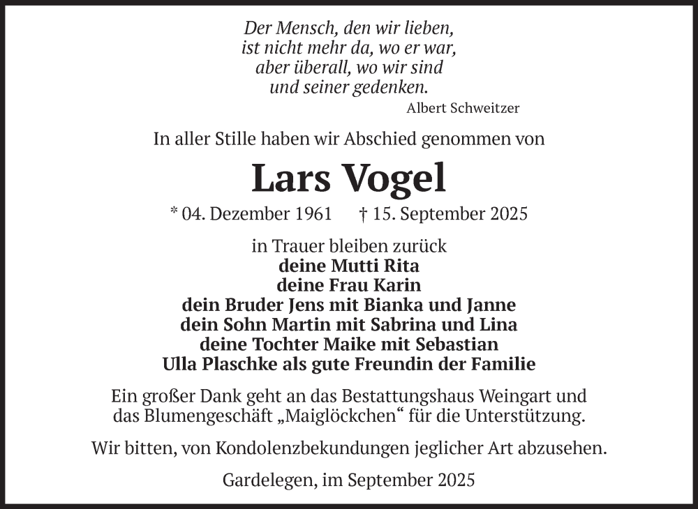 Hier finden Sie alle Traueranzeigen aus der Zeitung, die bisher für Lars Vogel erschienen sind. Weitere Traueranzeigen, die in der Zeitung erscheinen, werden hier ebenfalls aufgelistet