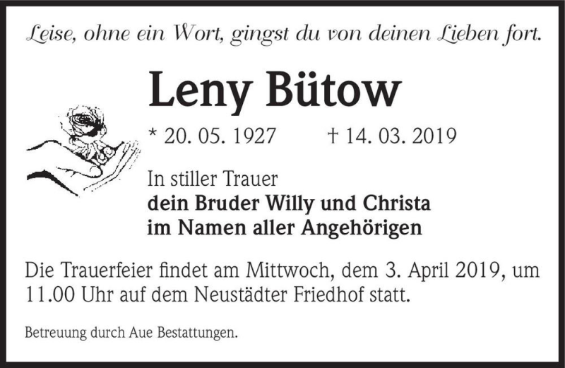 Hier finden Sie alle Traueranzeigen aus der Zeitung, die bisher für Leny Bütow erschienen sind. Weitere Traueranzeigen, die in der Zeitung erscheinen, werden hier ebenfalls aufgelistet