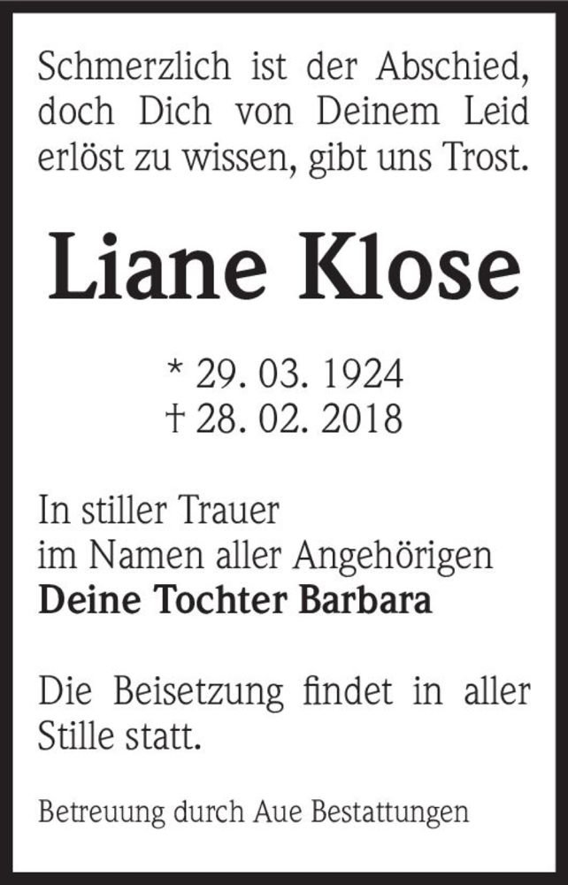 Hier finden Sie alle Traueranzeigen aus der Zeitung, die bisher für Liane Klose erschienen sind. Weitere Traueranzeigen, die in der Zeitung erscheinen, werden hier ebenfalls aufgelistet