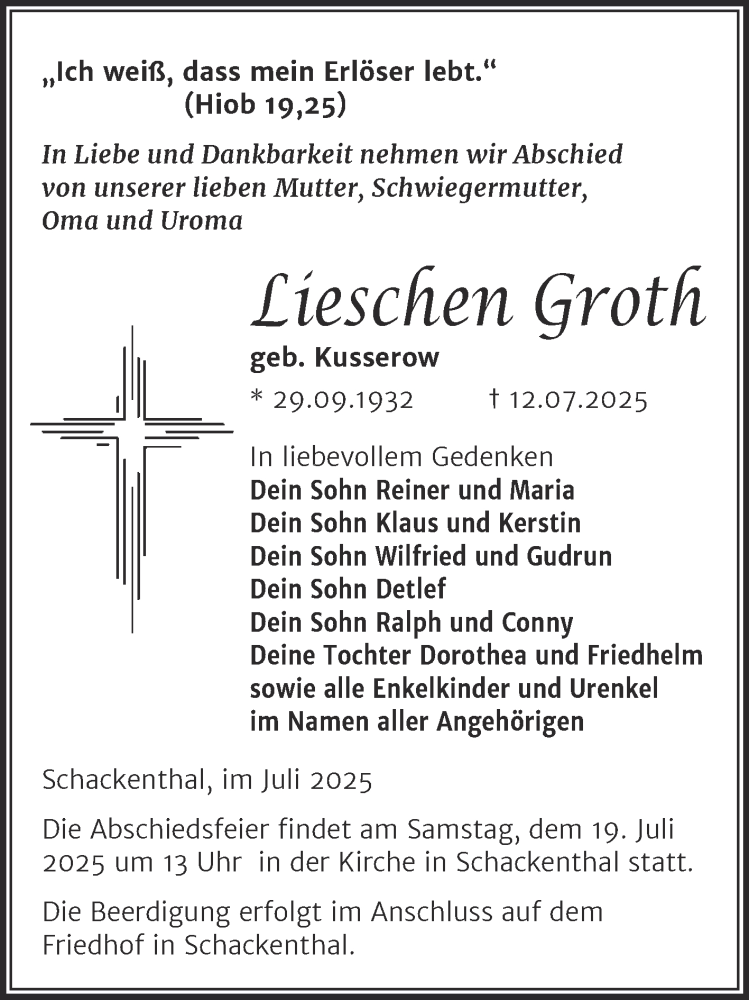 Hier finden Sie alle Traueranzeigen aus der Zeitung, die bisher für Lieschen Groth erschienen sind. Weitere Traueranzeigen, die in der Zeitung erscheinen, werden hier ebenfalls aufgelistet