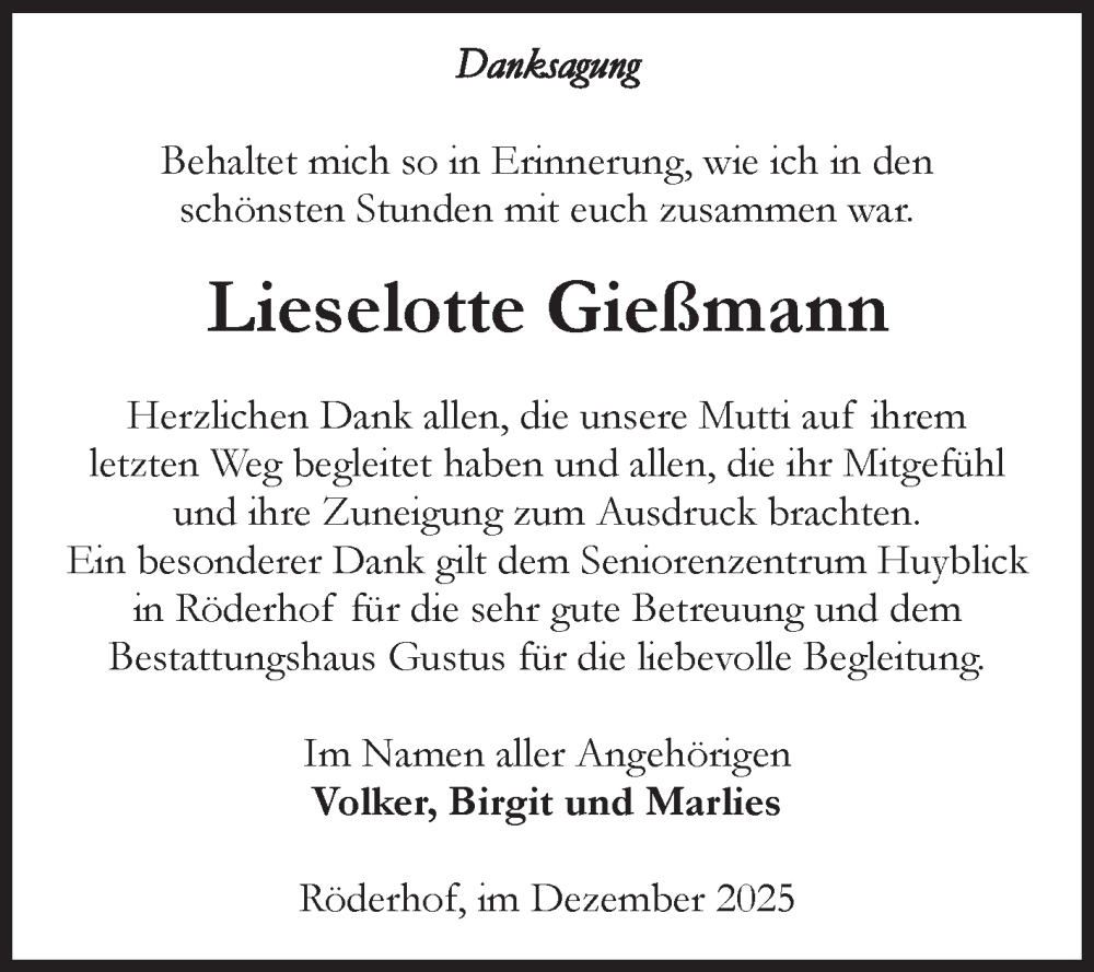 Hier finden Sie alle Traueranzeigen aus der Zeitung, die bisher für Lieselotte Gießmann erschienen sind. Weitere Traueranzeigen, die in der Zeitung erscheinen, werden hier ebenfalls aufgelistet