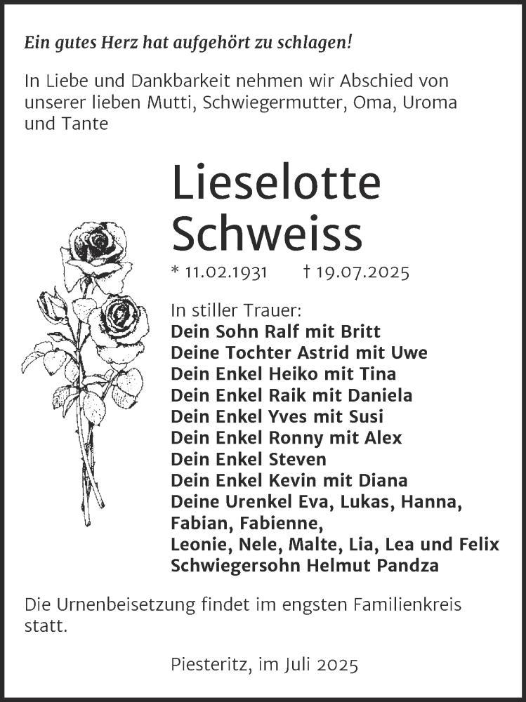 Hier finden Sie alle Traueranzeigen aus der Zeitung, die bisher für Lieselotte Schweiss erschienen sind. Weitere Traueranzeigen, die in der Zeitung erscheinen, werden hier ebenfalls aufgelistet