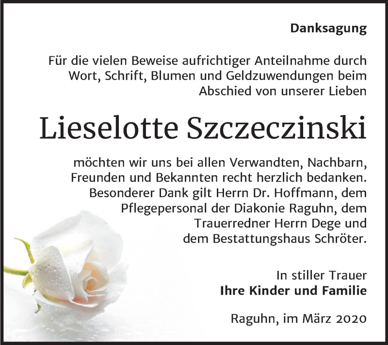 Hier finden Sie alle Traueranzeigen aus der Zeitung, die bisher für Lieselotte Szczeczinski erschienen sind. Weitere Traueranzeigen, die in der Zeitung erscheinen, werden hier ebenfalls aufgelistet