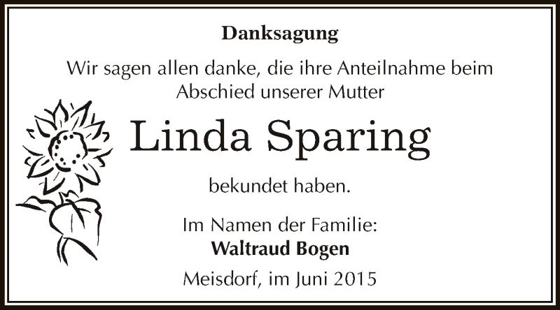 Hier finden Sie alle Traueranzeigen aus der Zeitung, die bisher für Linda Sparing erschienen sind. Weitere Traueranzeigen, die in der Zeitung erscheinen, werden hier ebenfalls aufgelistet