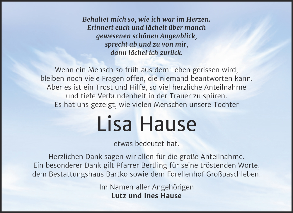 Hier finden Sie alle Traueranzeigen aus der Zeitung, die bisher für Lisa Hause erschienen sind. Weitere Traueranzeigen, die in der Zeitung erscheinen, werden hier ebenfalls aufgelistet