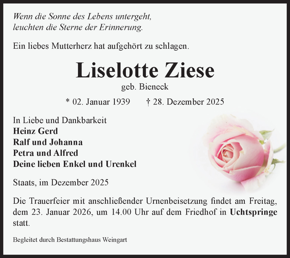 Hier finden Sie alle Traueranzeigen aus der Zeitung, die bisher für Liselotte Ziese erschienen sind. Weitere Traueranzeigen, die in der Zeitung erscheinen, werden hier ebenfalls aufgelistet