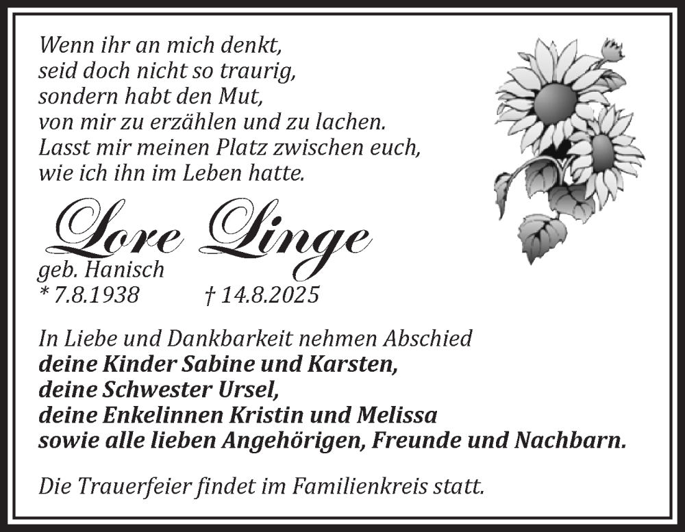 Hier finden Sie alle Traueranzeigen aus der Zeitung, die bisher für Lore Linge erschienen sind. Weitere Traueranzeigen, die in der Zeitung erscheinen, werden hier ebenfalls aufgelistet