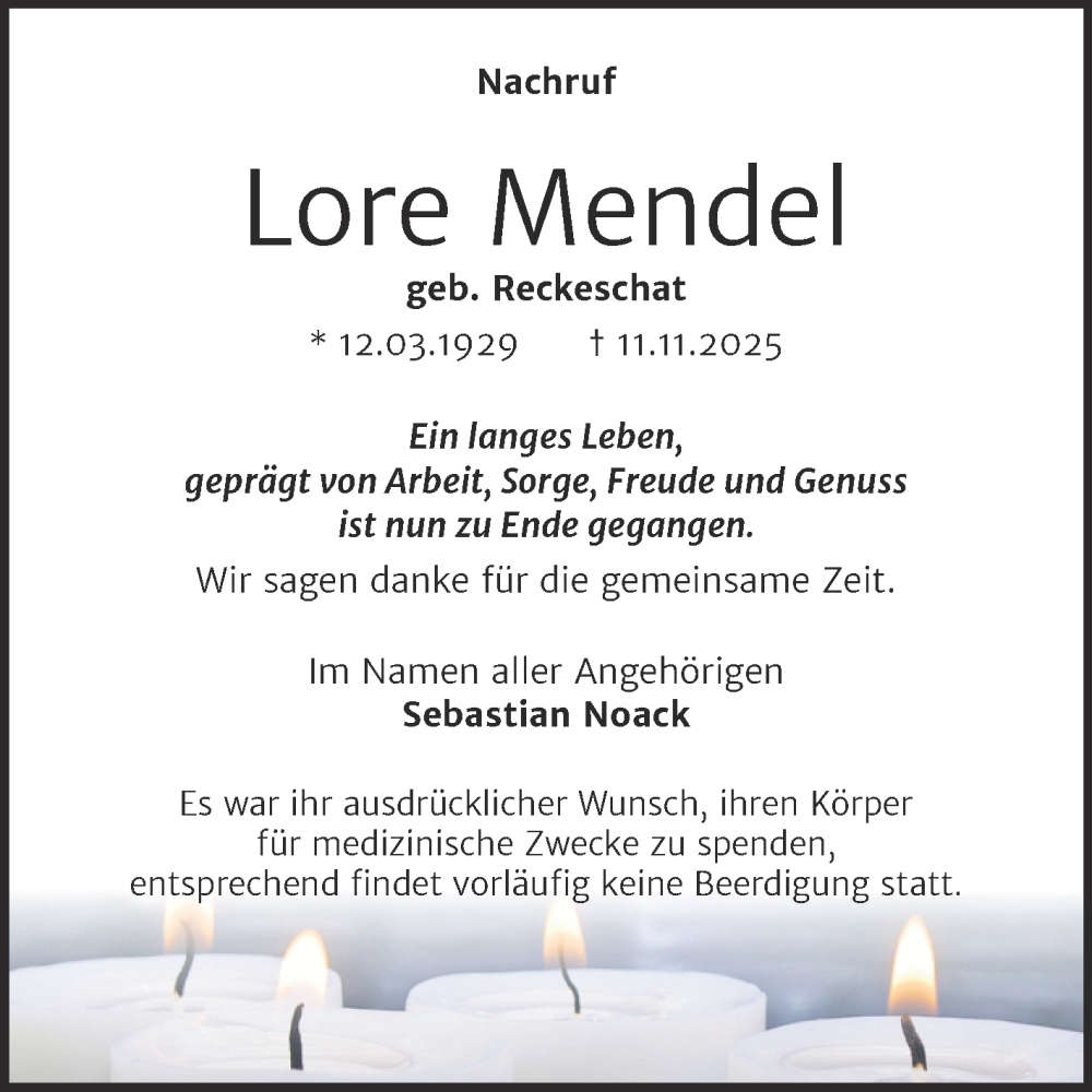 Hier finden Sie alle Traueranzeigen aus der Zeitung, die bisher für Lore Mendel erschienen sind. Weitere Traueranzeigen, die in der Zeitung erscheinen, werden hier ebenfalls aufgelistet
