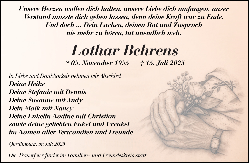 Hier finden Sie alle Traueranzeigen aus der Zeitung, die bisher für Lothar Behrens erschienen sind. Weitere Traueranzeigen, die in der Zeitung erscheinen, werden hier ebenfalls aufgelistet