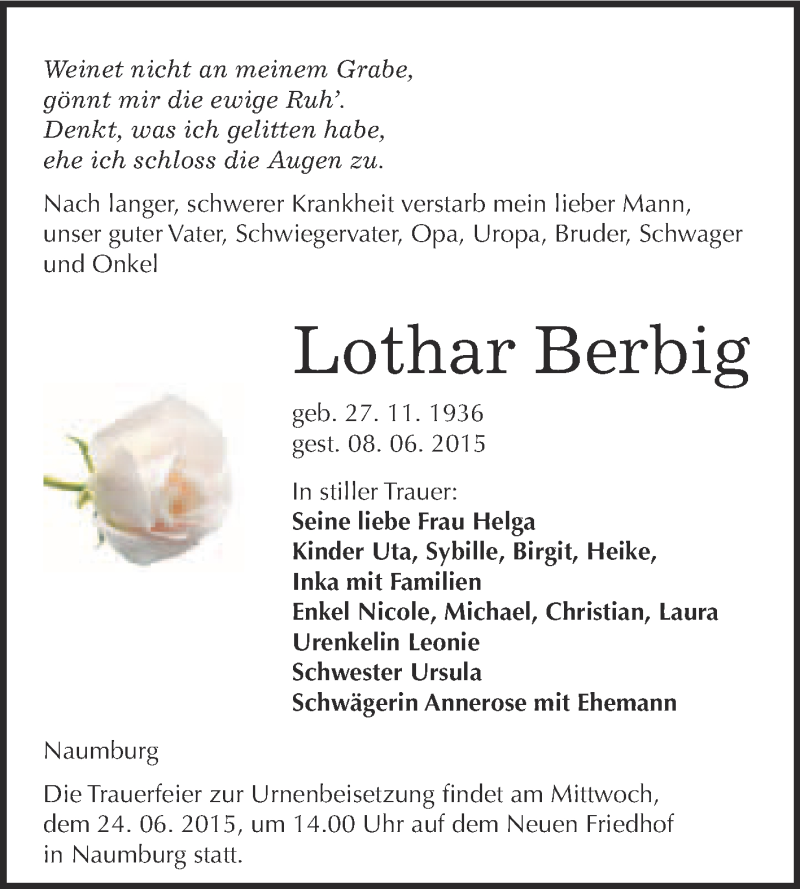 Hier finden Sie alle Traueranzeigen aus der Zeitung, die bisher für Lothar Berbig erschienen sind. Weitere Traueranzeigen, die in der Zeitung erscheinen, werden hier ebenfalls aufgelistet