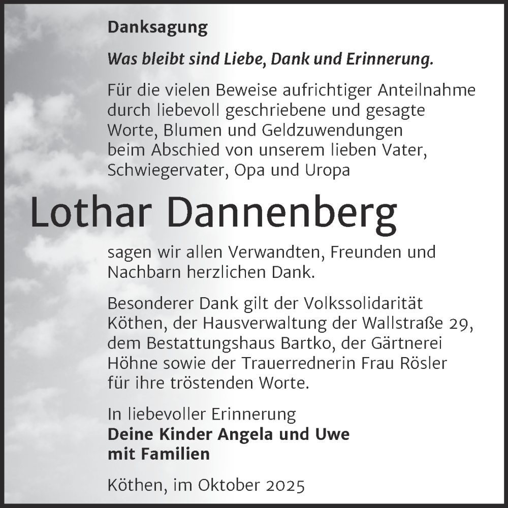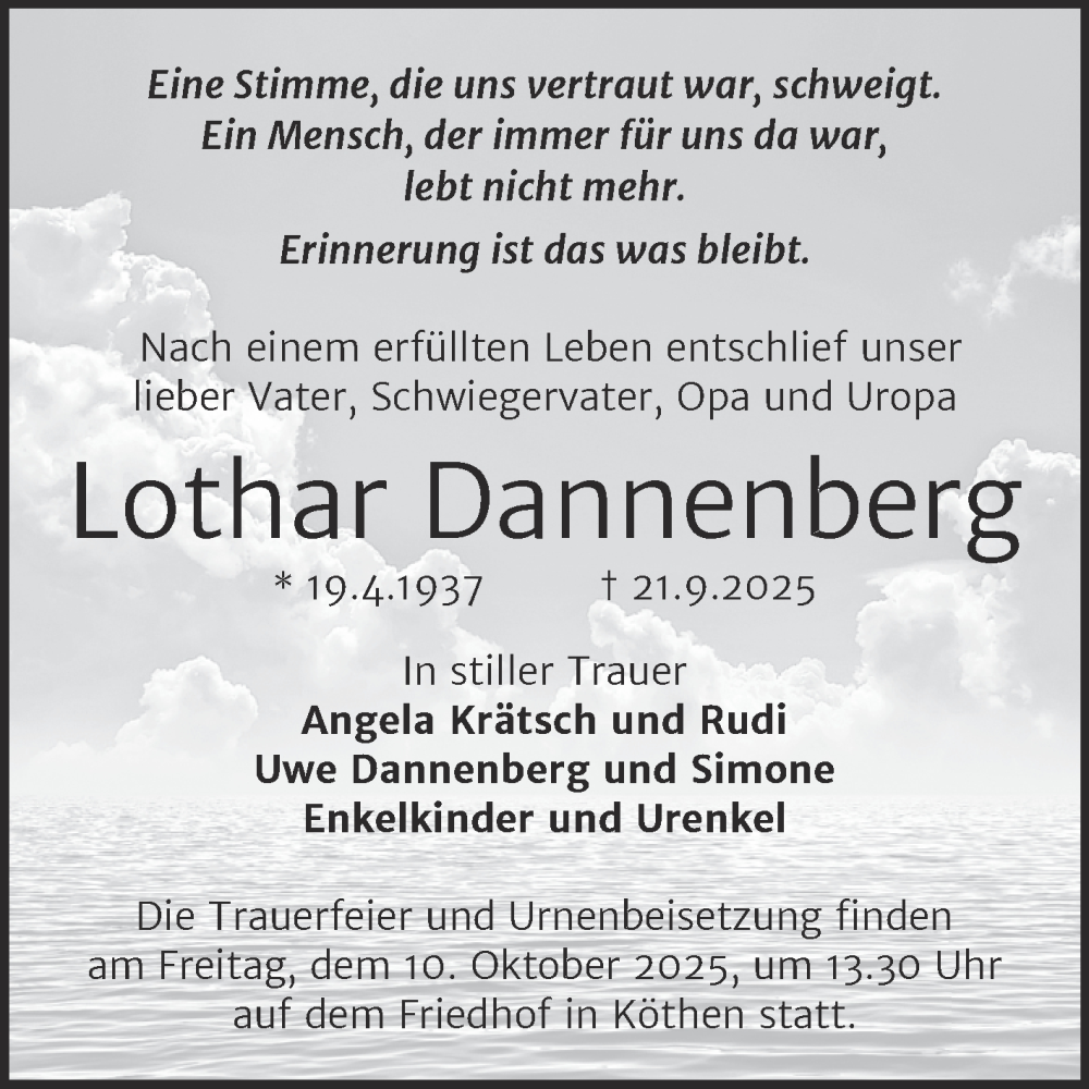 Hier finden Sie alle Traueranzeigen aus der Zeitung, die bisher für Lothar Dannenberg erschienen sind. Weitere Traueranzeigen, die in der Zeitung erscheinen, werden hier ebenfalls aufgelistet