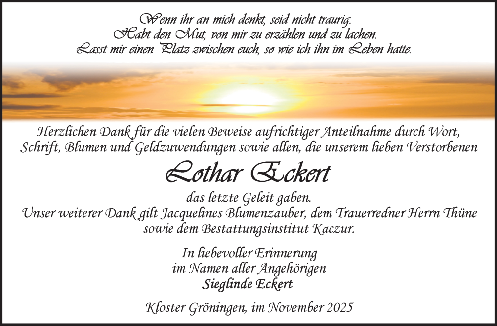Hier finden Sie alle Traueranzeigen aus der Zeitung, die bisher für Lothar Eckert erschienen sind. Weitere Traueranzeigen, die in der Zeitung erscheinen, werden hier ebenfalls aufgelistet