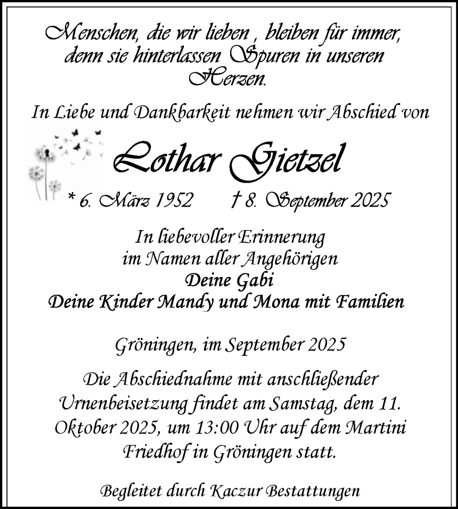 Hier finden Sie alle Traueranzeigen aus der Zeitung, die bisher für Lothar Gietzel erschienen sind. Weitere Traueranzeigen, die in der Zeitung erscheinen, werden hier ebenfalls aufgelistet