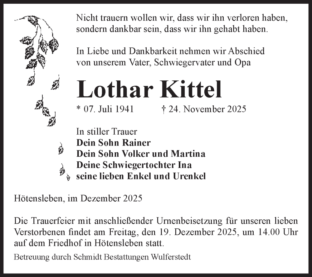 Hier finden Sie alle Traueranzeigen aus der Zeitung, die bisher für Lothar Kittel erschienen sind. Weitere Traueranzeigen, die in der Zeitung erscheinen, werden hier ebenfalls aufgelistet