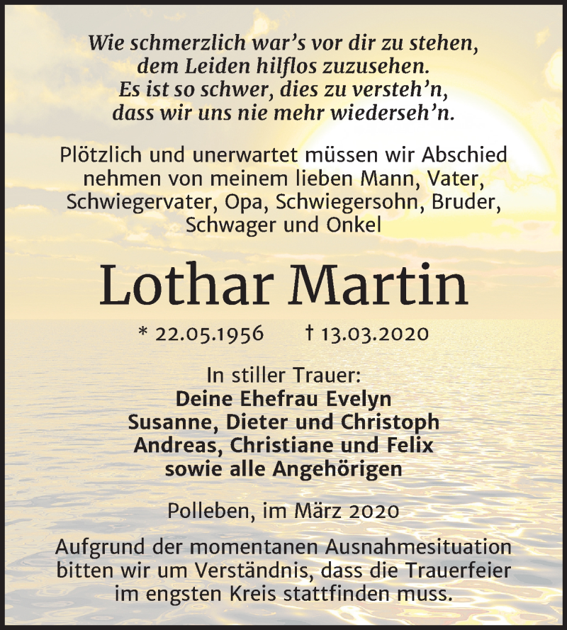 Hier finden Sie alle Traueranzeigen aus der Zeitung, die bisher für Lothar Martin erschienen sind. Weitere Traueranzeigen, die in der Zeitung erscheinen, werden hier ebenfalls aufgelistet