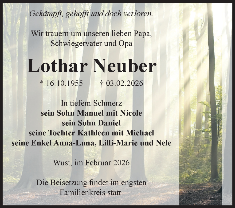 Hier finden Sie alle Traueranzeigen aus der Zeitung, die bisher für Lothar Neuber erschienen sind. Weitere Traueranzeigen, die in der Zeitung erscheinen, werden hier ebenfalls aufgelistet