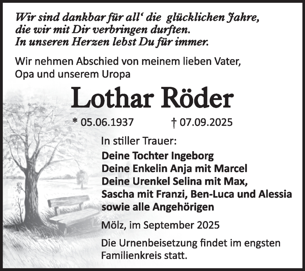 Hier finden Sie alle Traueranzeigen aus der Zeitung, die bisher für Lothar Röder erschienen sind. Weitere Traueranzeigen, die in der Zeitung erscheinen, werden hier ebenfalls aufgelistet