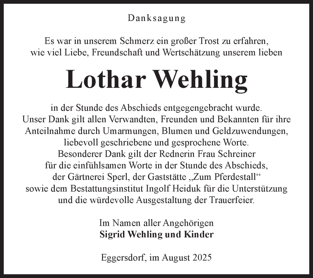 Hier finden Sie alle Traueranzeigen aus der Zeitung, die bisher für Lothar Wehling erschienen sind. Weitere Traueranzeigen, die in der Zeitung erscheinen, werden hier ebenfalls aufgelistet