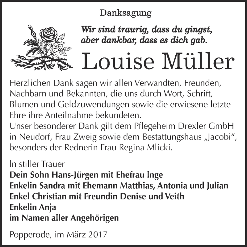Hier finden Sie alle Traueranzeigen aus der Zeitung, die bisher für Louise Müller erschienen sind. Weitere Traueranzeigen, die in der Zeitung erscheinen, werden hier ebenfalls aufgelistet