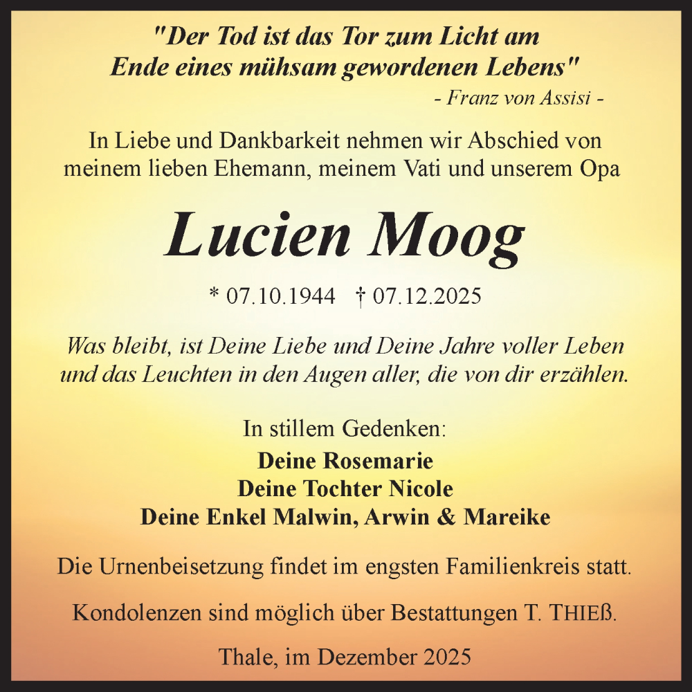 Hier finden Sie alle Traueranzeigen aus der Zeitung, die bisher für Lucien Moog erschienen sind. Weitere Traueranzeigen, die in der Zeitung erscheinen, werden hier ebenfalls aufgelistet