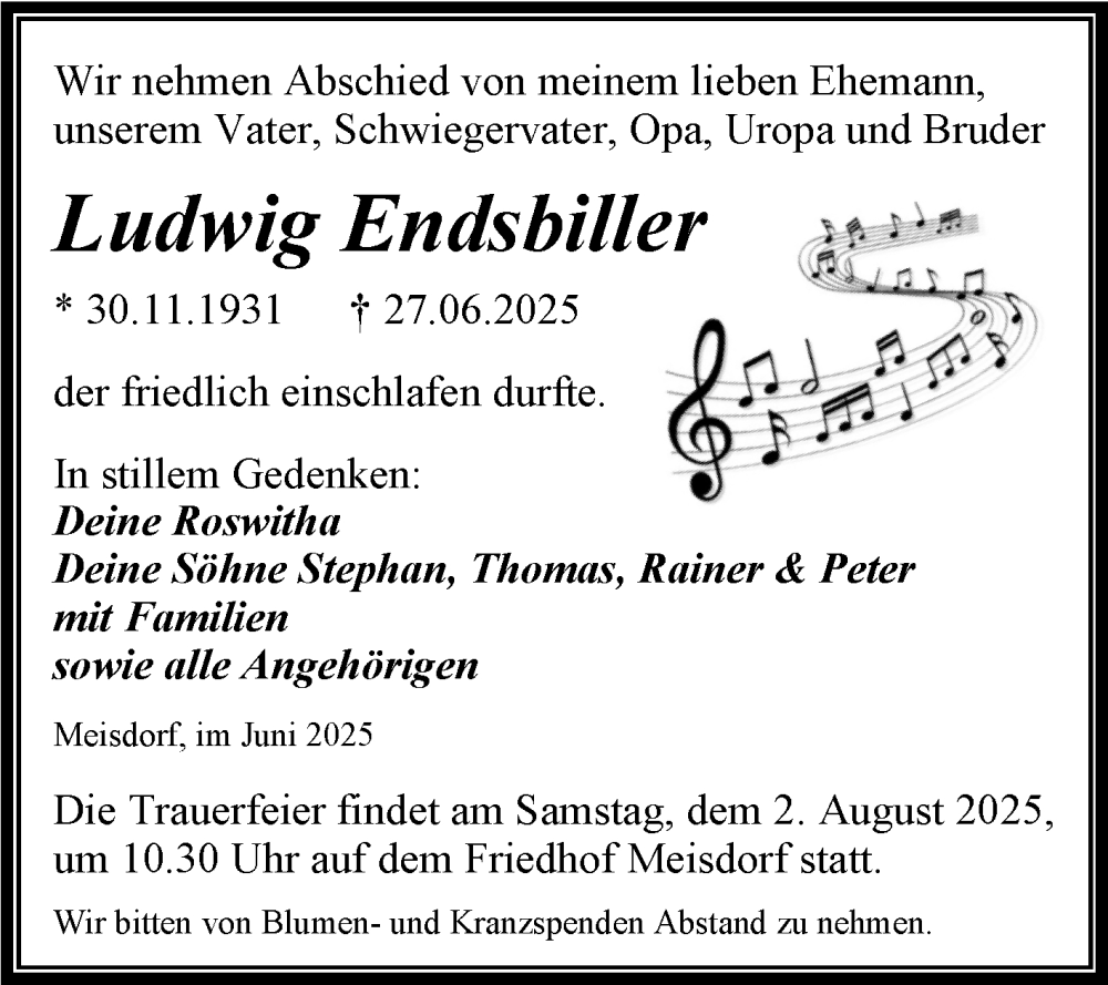 Hier finden Sie alle Traueranzeigen aus der Zeitung, die bisher für Ludwig Endsbiller erschienen sind. Weitere Traueranzeigen, die in der Zeitung erscheinen, werden hier ebenfalls aufgelistet