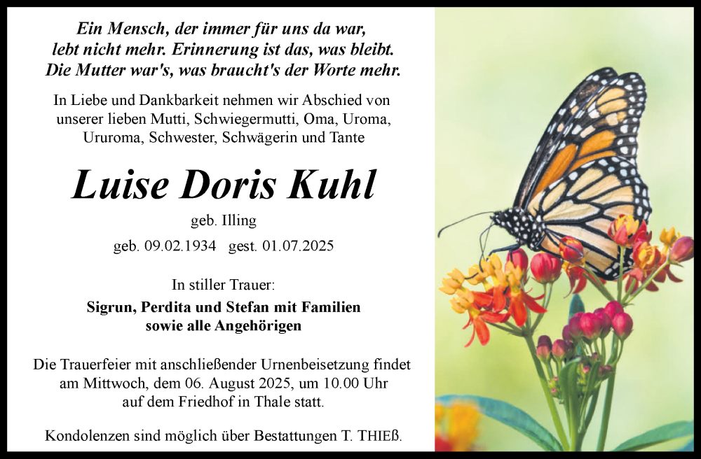 Hier finden Sie alle Traueranzeigen aus der Zeitung, die bisher für Luise Doris Kuhl erschienen sind. Weitere Traueranzeigen, die in der Zeitung erscheinen, werden hier ebenfalls aufgelistet