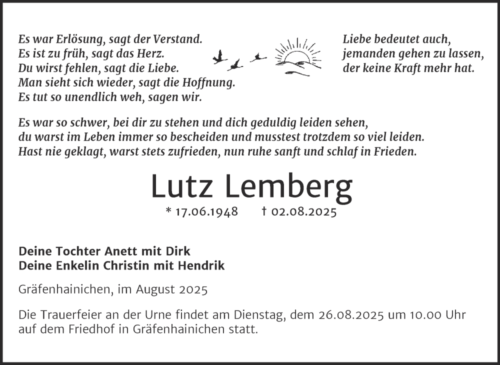 Hier finden Sie alle Traueranzeigen aus der Zeitung, die bisher für Lutz Lemberg erschienen sind. Weitere Traueranzeigen, die in der Zeitung erscheinen, werden hier ebenfalls aufgelistet