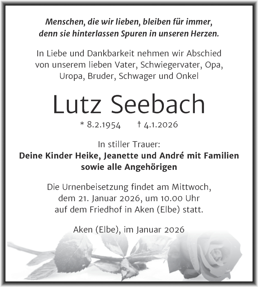 Hier finden Sie alle Traueranzeigen aus der Zeitung, die bisher für Lutz Seebach erschienen sind. Weitere Traueranzeigen, die in der Zeitung erscheinen, werden hier ebenfalls aufgelistet
