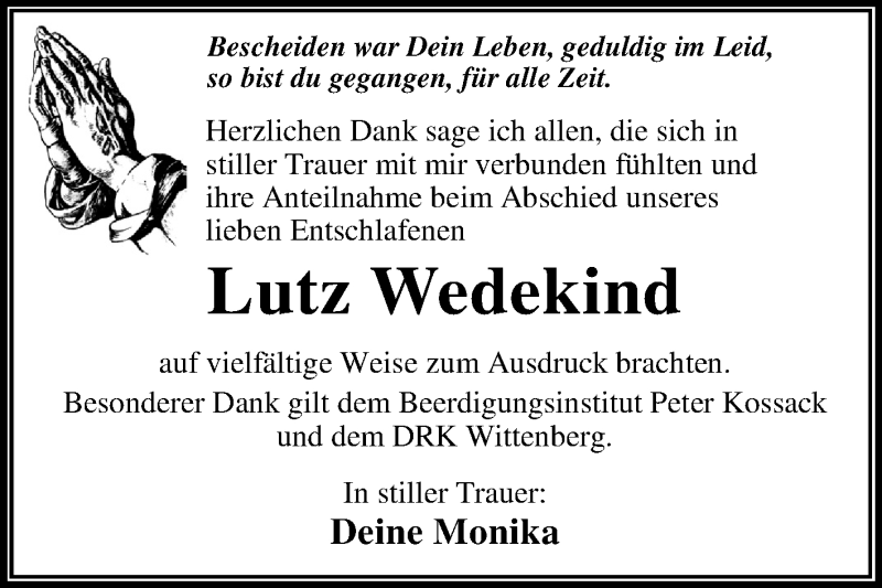 Hier finden Sie alle Traueranzeigen aus der Zeitung, die bisher für Lutz Wedekind erschienen sind. Weitere Traueranzeigen, die in der Zeitung erscheinen, werden hier ebenfalls aufgelistet