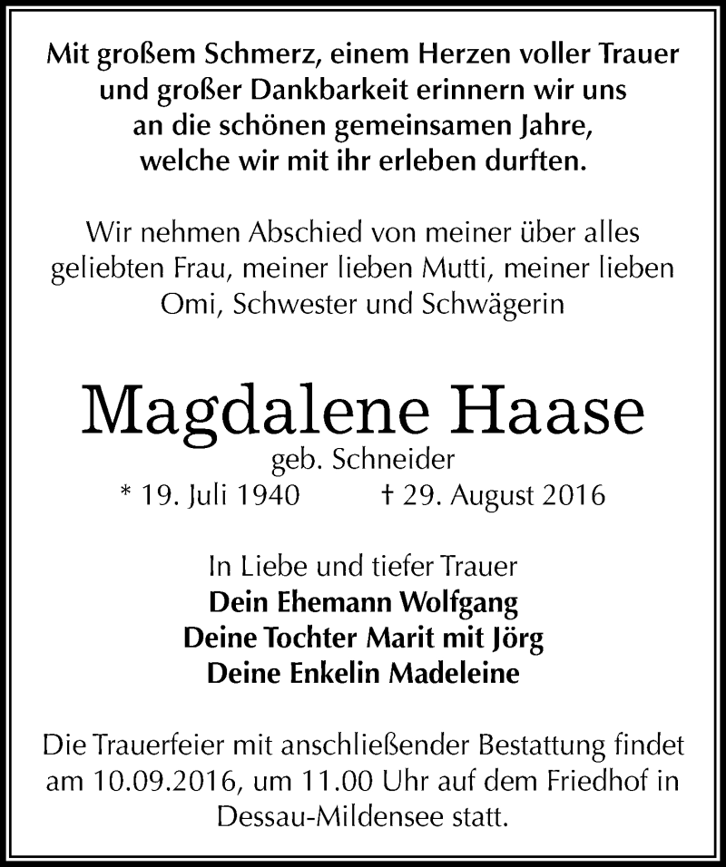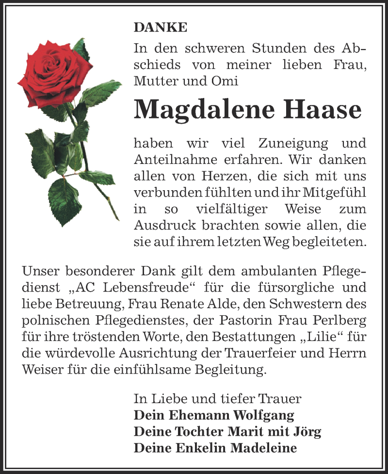 Hier finden Sie alle Traueranzeigen aus der Zeitung, die bisher für Magdalene Haase erschienen sind. Weitere Traueranzeigen, die in der Zeitung erscheinen, werden hier ebenfalls aufgelistet