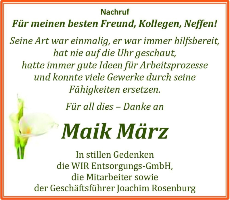 Hier finden Sie alle Traueranzeigen aus der Zeitung, die bisher für Maik März erschienen sind. Weitere Traueranzeigen, die in der Zeitung erscheinen, werden hier ebenfalls aufgelistet