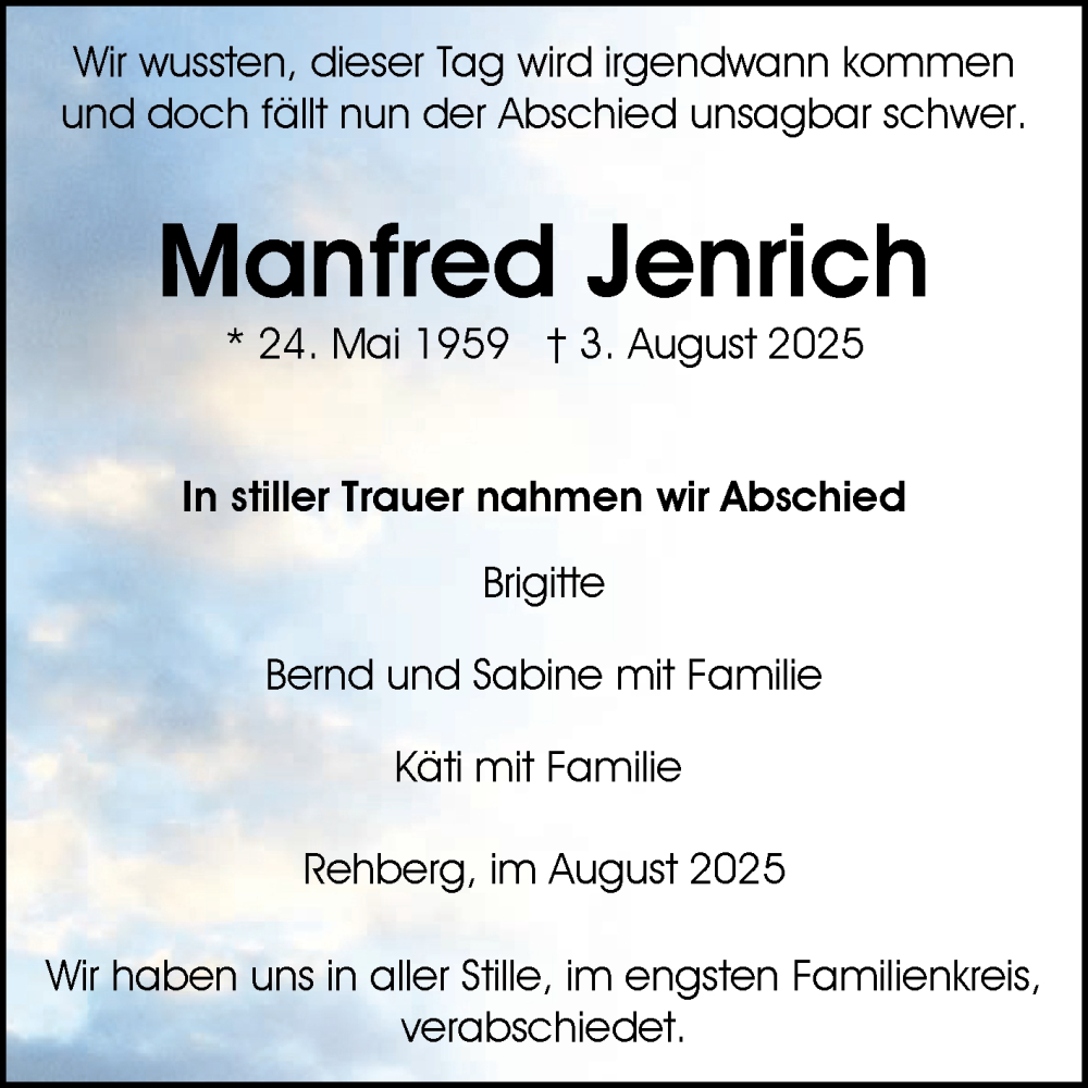Hier finden Sie alle Traueranzeigen aus der Zeitung, die bisher für Manfred Jenrich erschienen sind. Weitere Traueranzeigen, die in der Zeitung erscheinen, werden hier ebenfalls aufgelistet