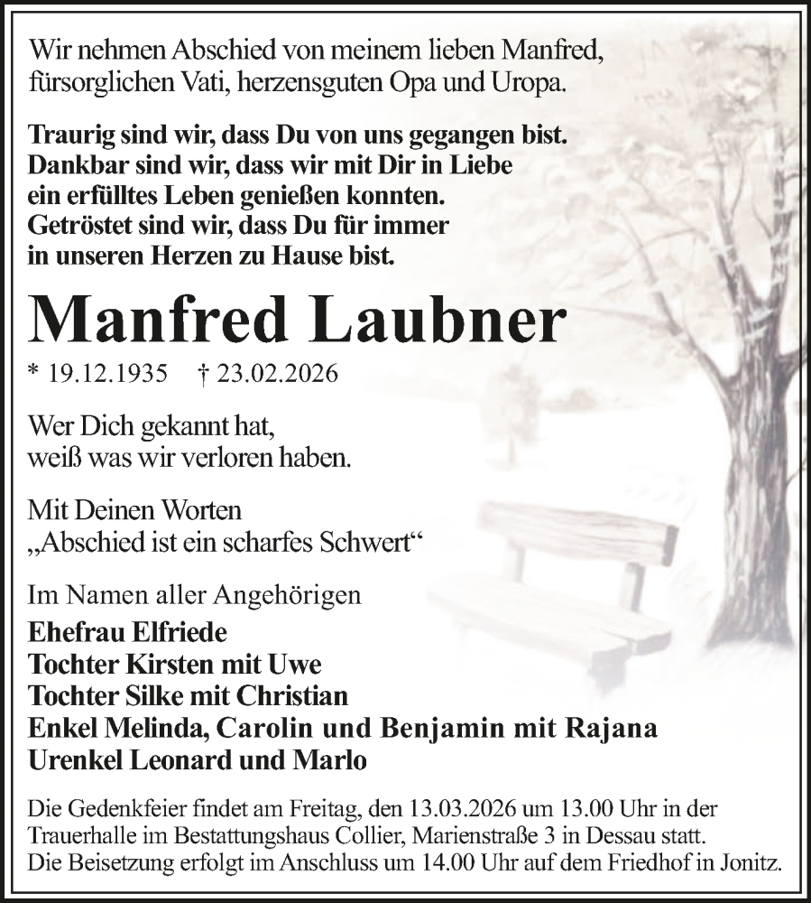 Hier finden Sie alle Traueranzeigen aus der Zeitung, die bisher für Manfred Laubner erschienen sind. Weitere Traueranzeigen, die in der Zeitung erscheinen, werden hier ebenfalls aufgelistet