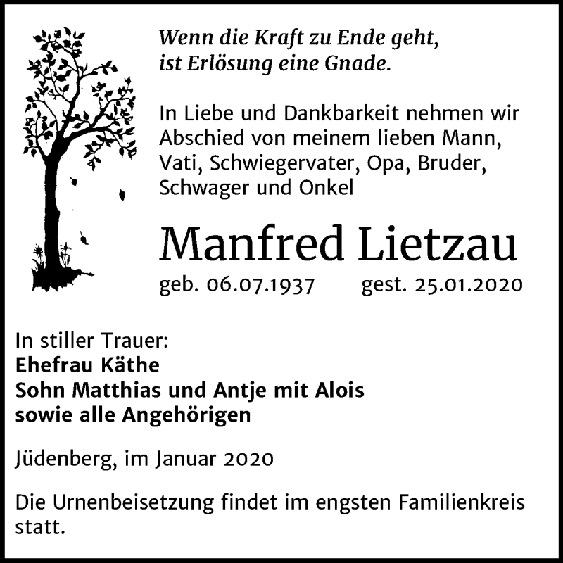 Hier finden Sie alle Traueranzeigen aus der Zeitung, die bisher für Manfred Lietzau erschienen sind. Weitere Traueranzeigen, die in der Zeitung erscheinen, werden hier ebenfalls aufgelistet