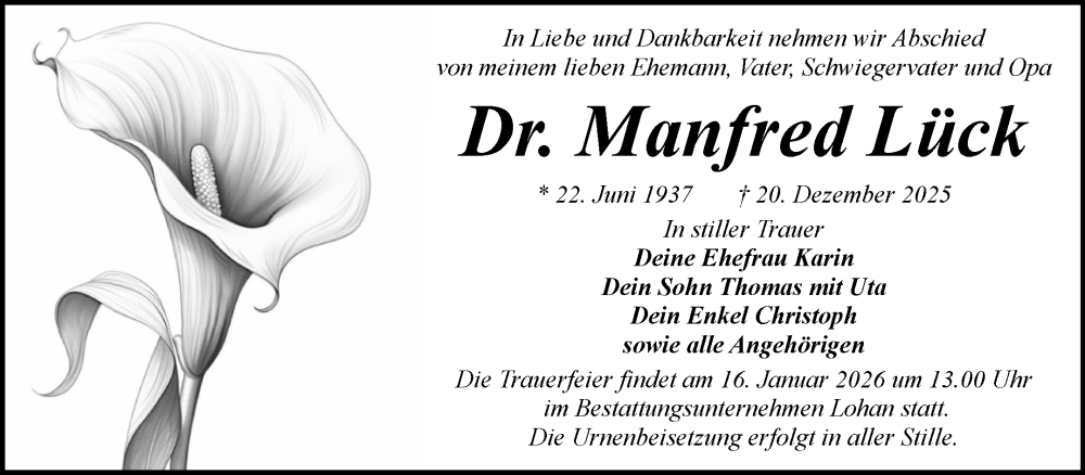 Hier finden Sie alle Traueranzeigen aus der Zeitung, die bisher für Manfred Lück erschienen sind. Weitere Traueranzeigen, die in der Zeitung erscheinen, werden hier ebenfalls aufgelistet