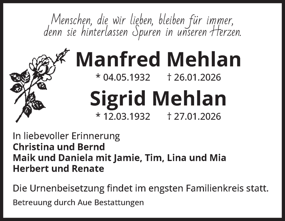 Hier finden Sie alle Traueranzeigen aus der Zeitung, die bisher für Manfred Mehlan erschienen sind. Weitere Traueranzeigen, die in der Zeitung erscheinen, werden hier ebenfalls aufgelistet